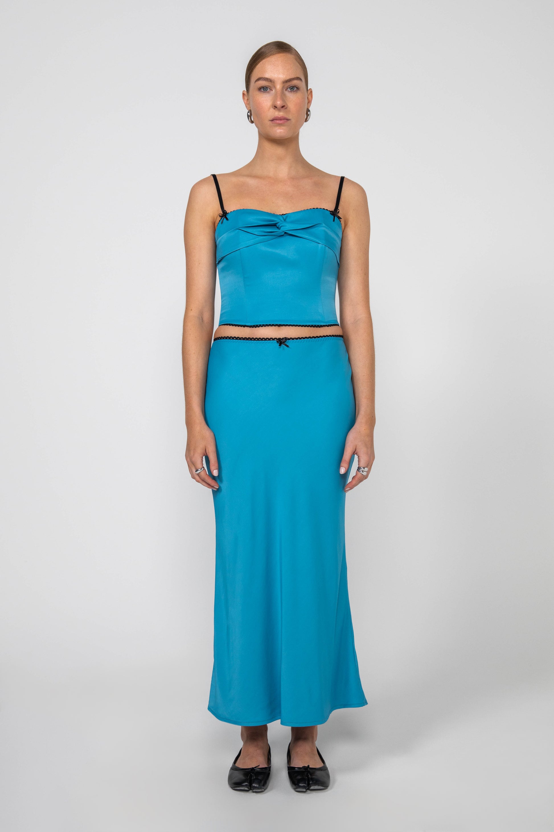 The Anna Top in sky blue is made from a soft viscose and bamboo blend fabric. It features a twisted bust detail, a black lace trim and black bows. It is a structured bodice with boning, adjustable rouleau straps and a lace up back closure.