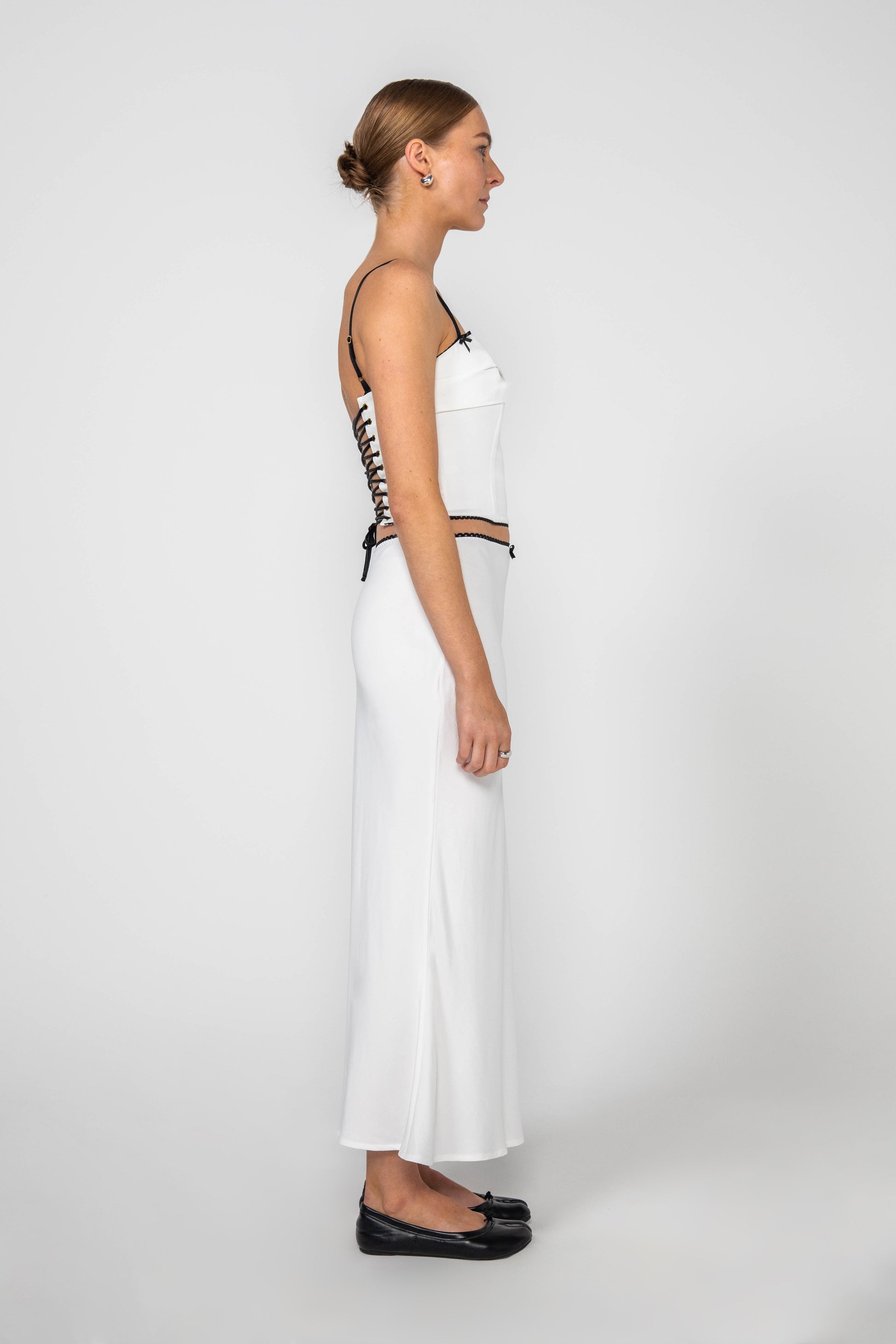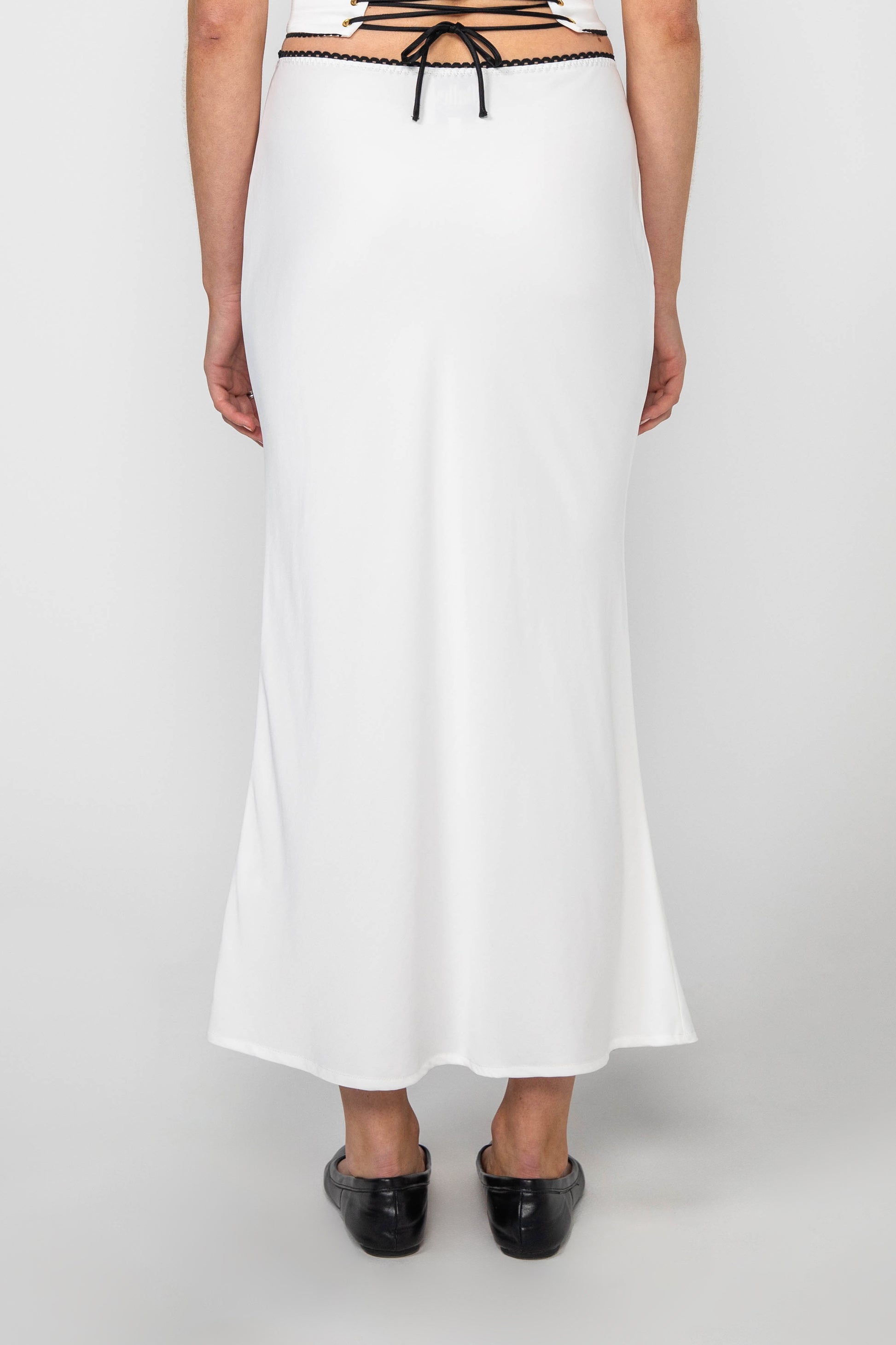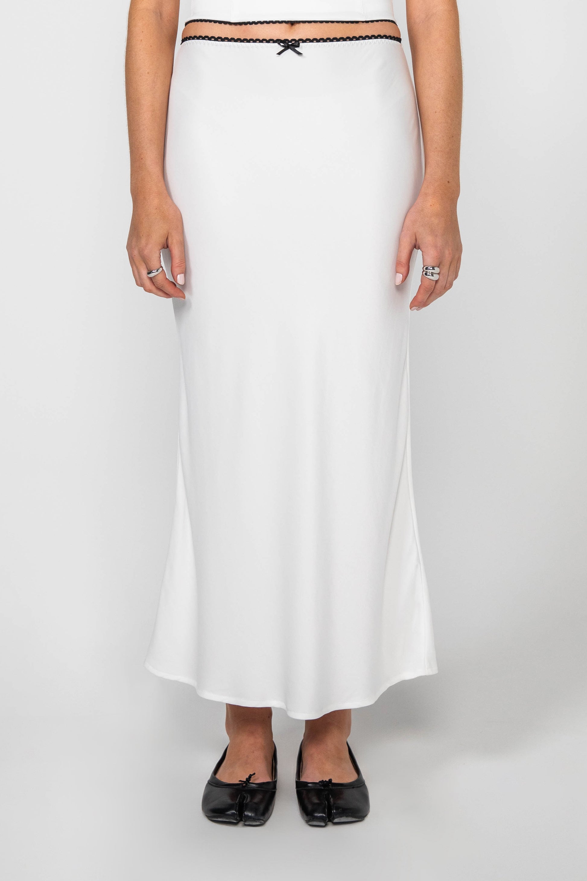 The Hayley Midi Skirt in white is made from a soft viscose and bamboo blend fabric. This bias cut midi skirt features a black lace trim and a black bow on the waist. It is designed to be worn high waisted or mid waisted with an elasticated waist.