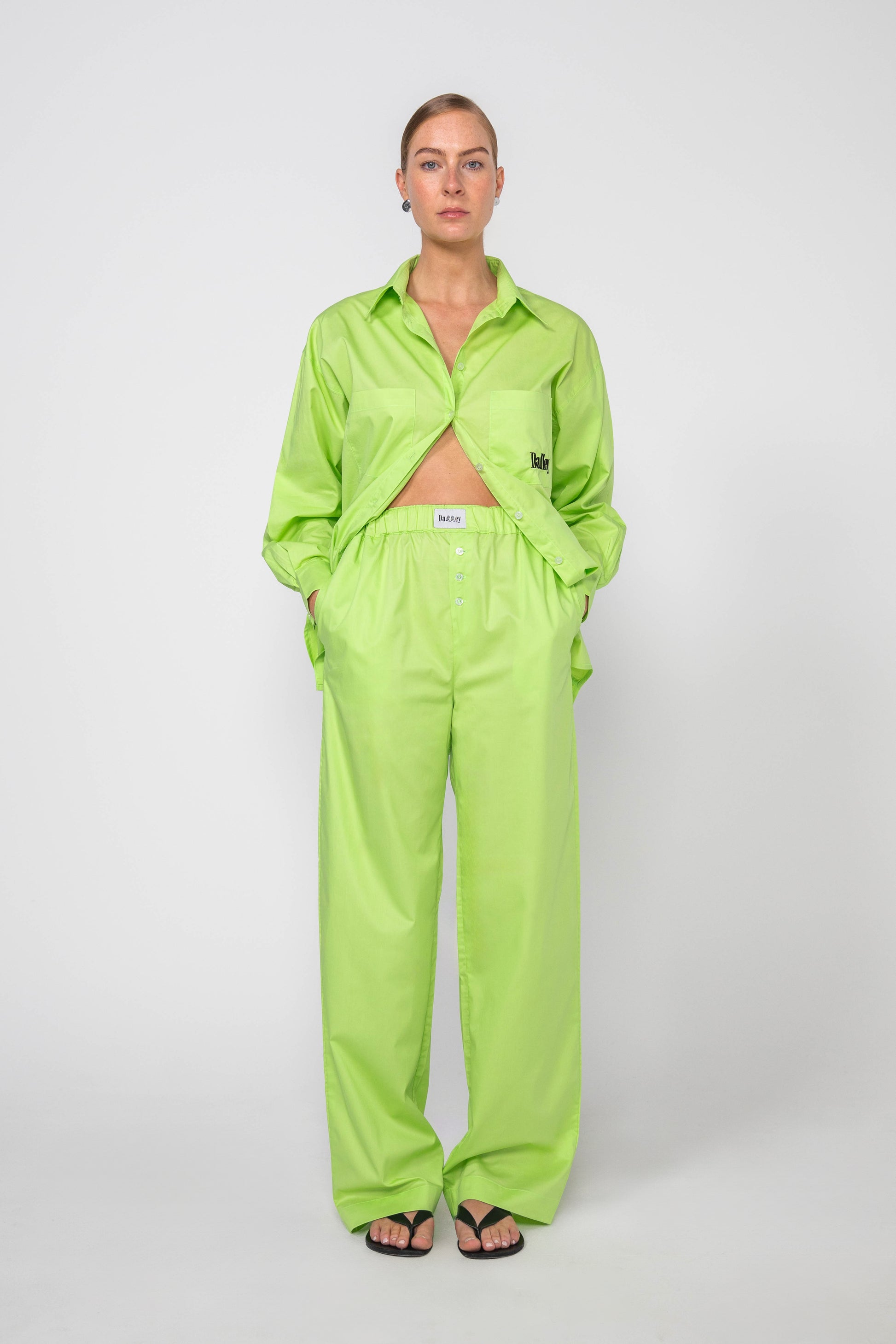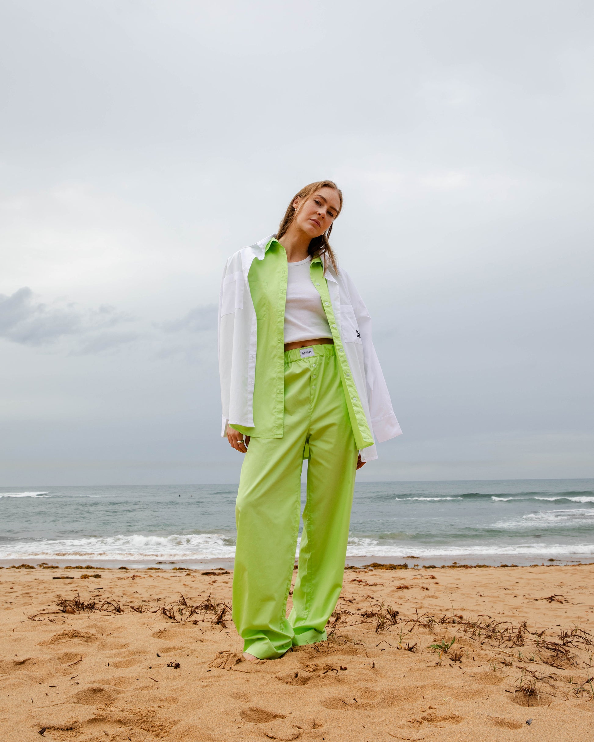 The Keely Pant in lime is made from a smooth cotton fabric. This boxer style, full length pant features an elasticated waistband that sits high waisted. It has a straight-leg silhouette, side pockets, a non functional fly with flat clear buttons and a specialty Dalley logo patch on the front waistband.